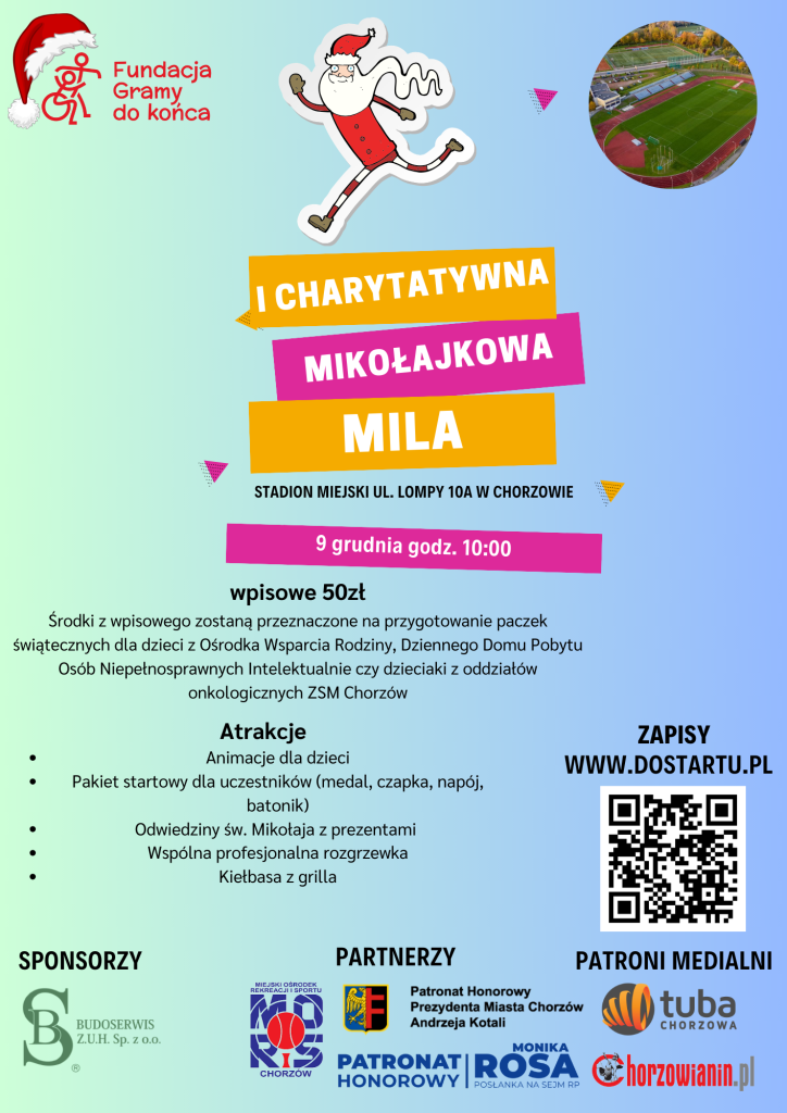 I Charytatywna Mikołajkowa Mila w Chorzowie odbędzie się 9. grudnia o godz. 10:00 na Stadionie Miejskim przy ul. Lompy! Wydarzenie to organizowane jest przez Fundację Gramy do Końca. Przygotowano wiele atrakcji dla najmłodszych i nie tylko! Celem tego wydarzenia jest zebranie środków na przygotowanie paczek dla potrzebujących dzieci!